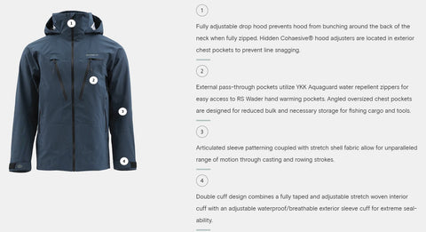 Intended as your cold weather solution, the RS jacket is designed to fit over an insulation piece like a Fusion Hybrid or 3/2 Puffy and your waders and is sized up about a half size to accommodate the extra bulk.